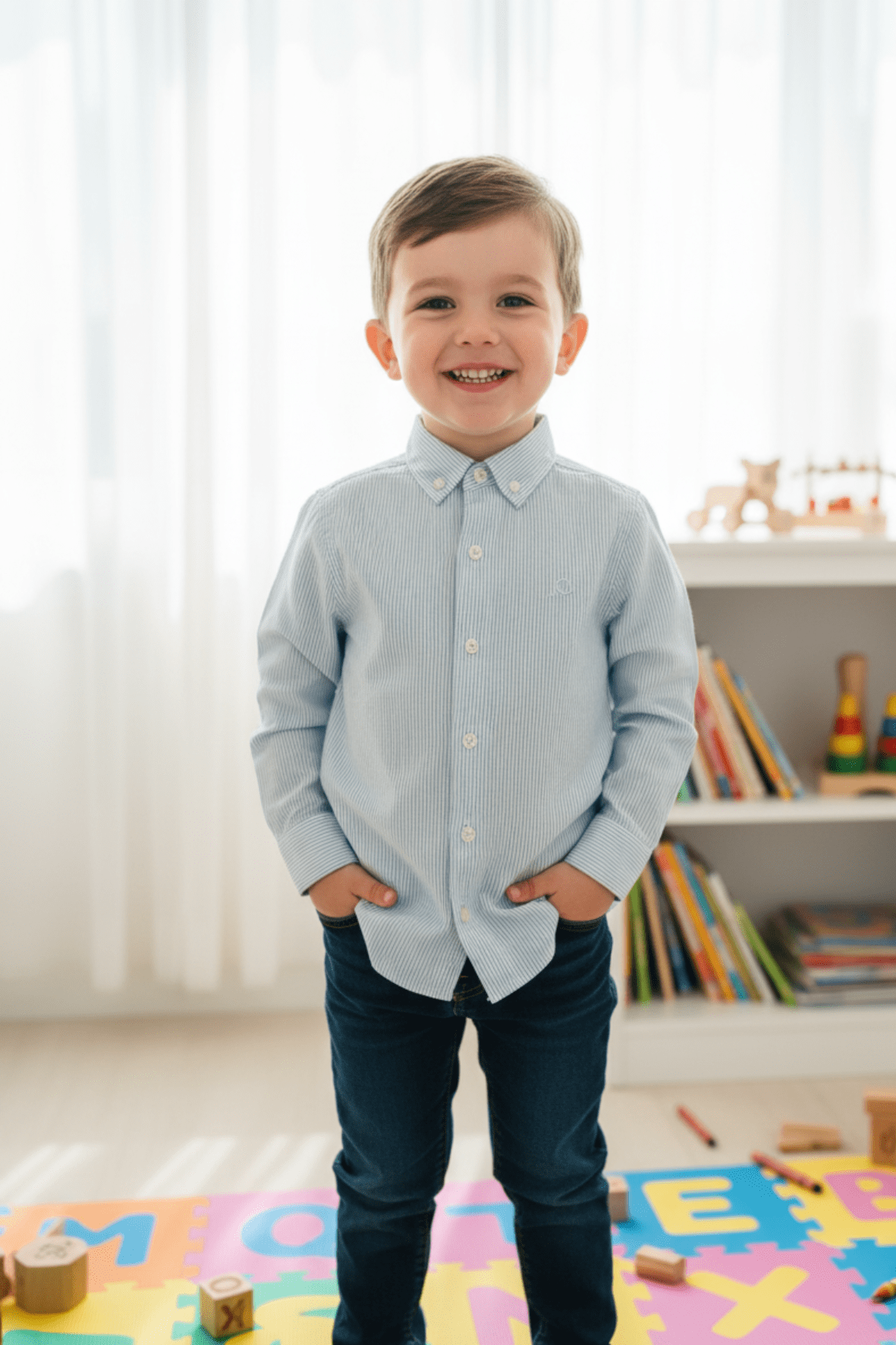 Camisa de vestir de rayas celeste para niño.