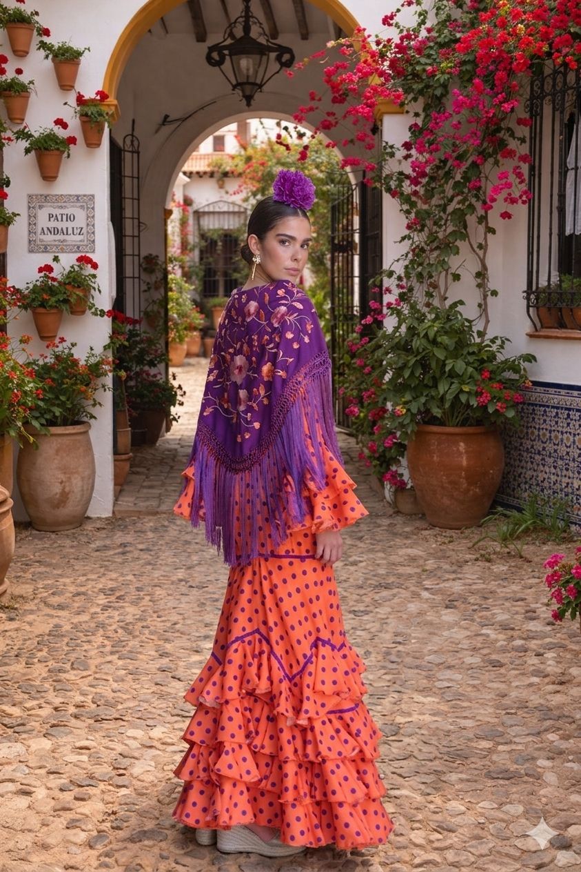 Vestido de flamenca para mujer de color naranja con lunares morados, de manga larga y falda canastera.