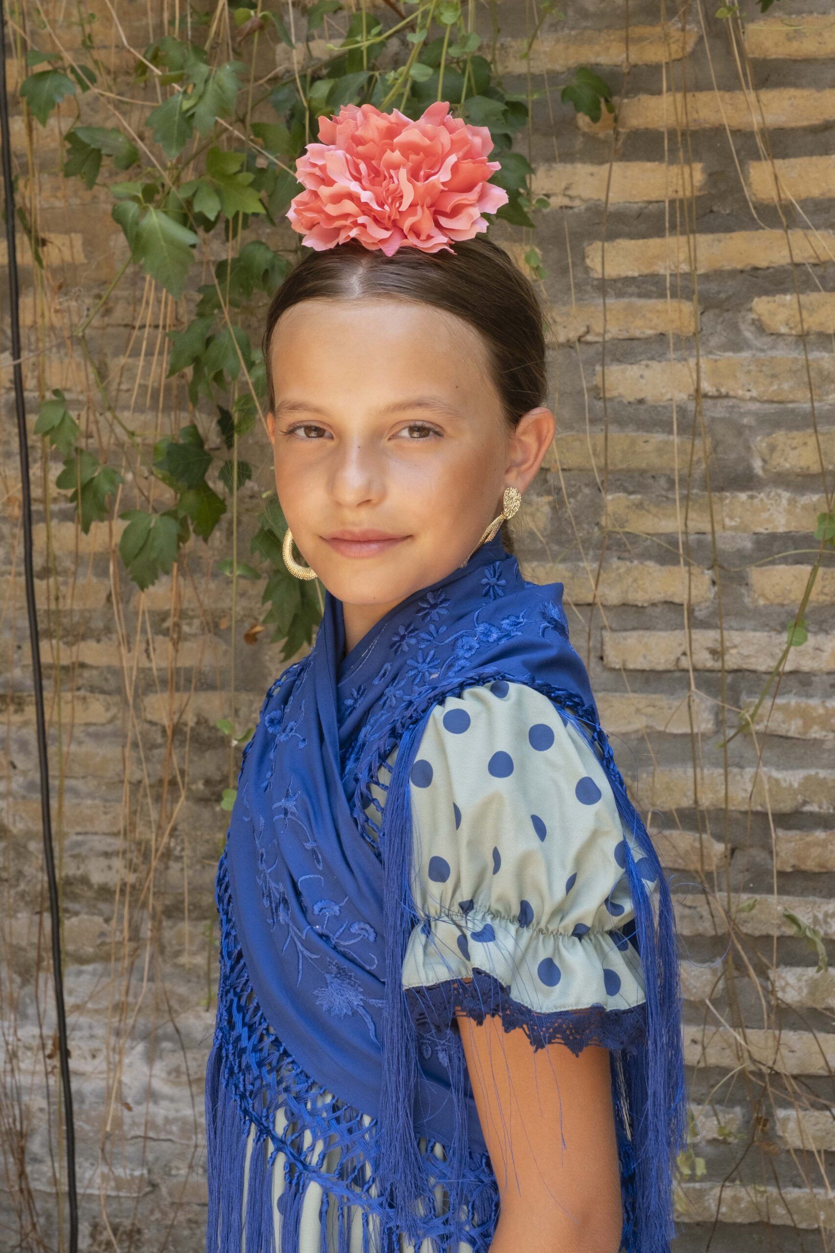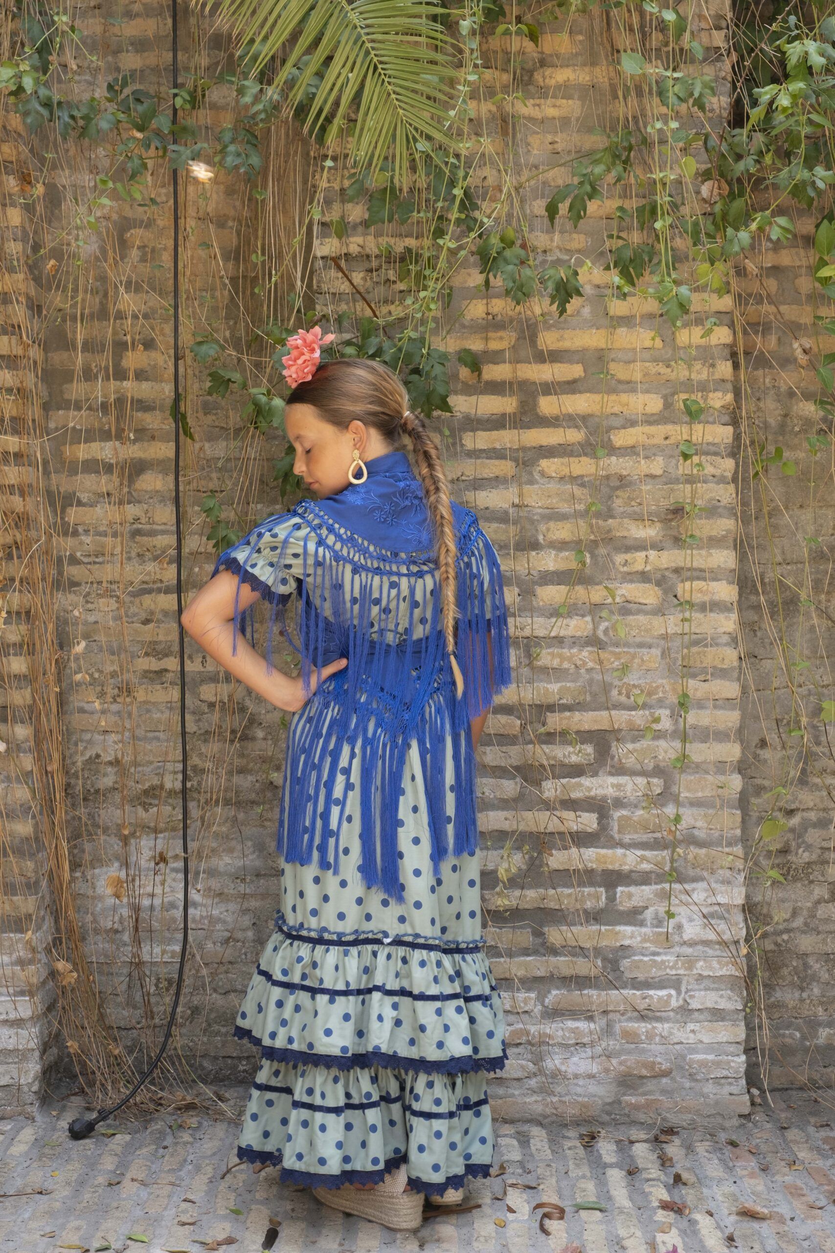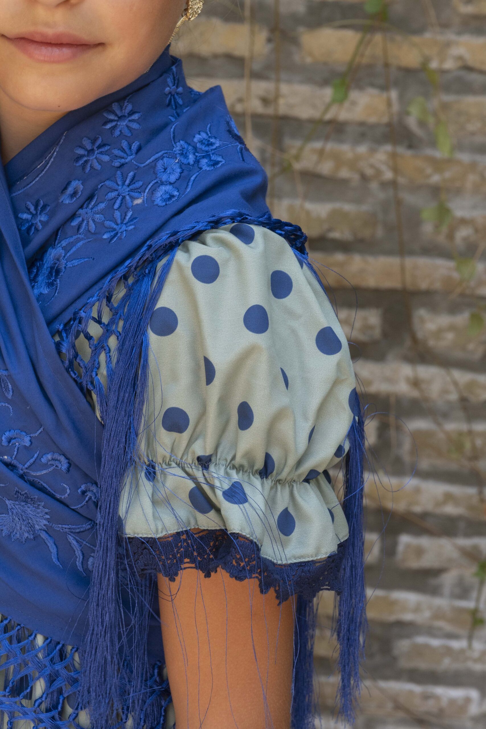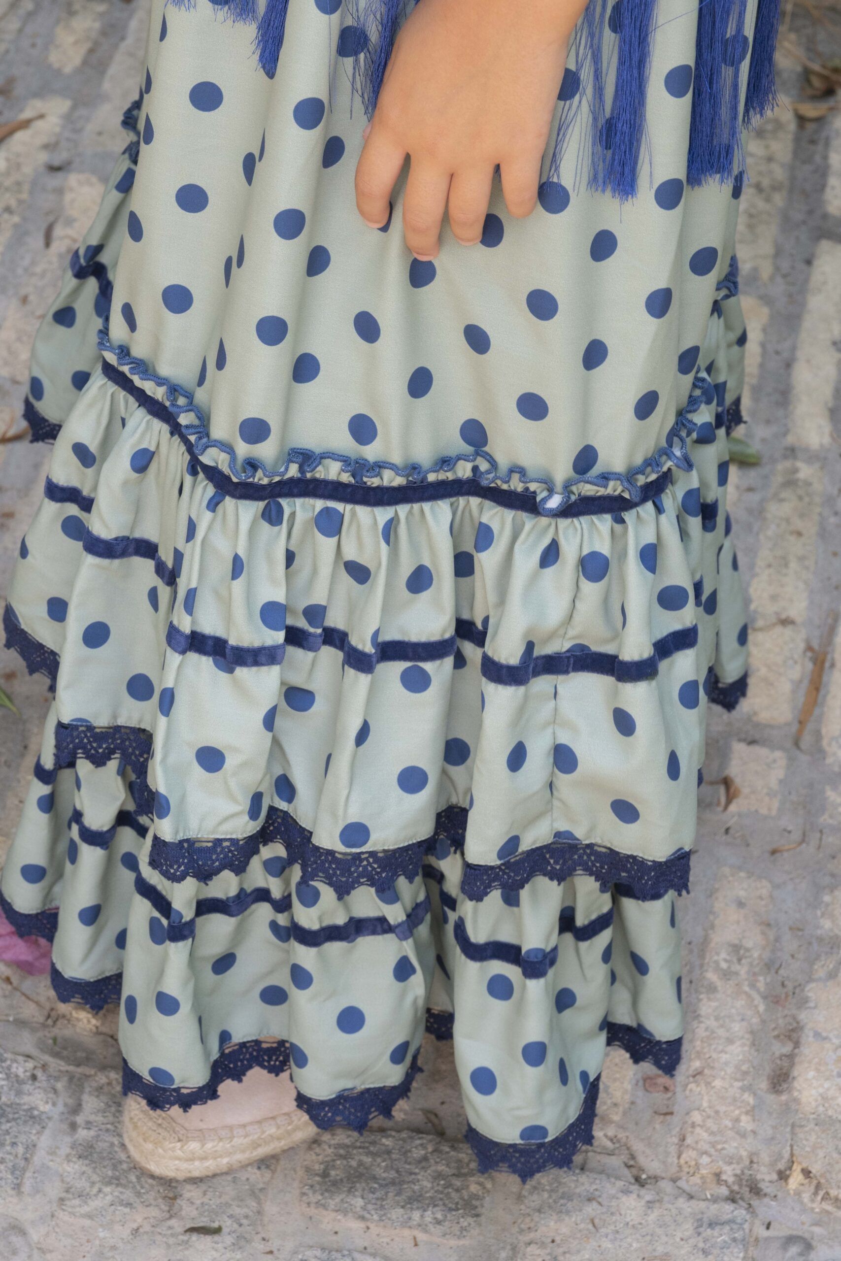 Vestido de flamenca para niña pequeña de color verde con lunares azules, de talle alto, manga de farol, bajo de volantes y falda canastera.