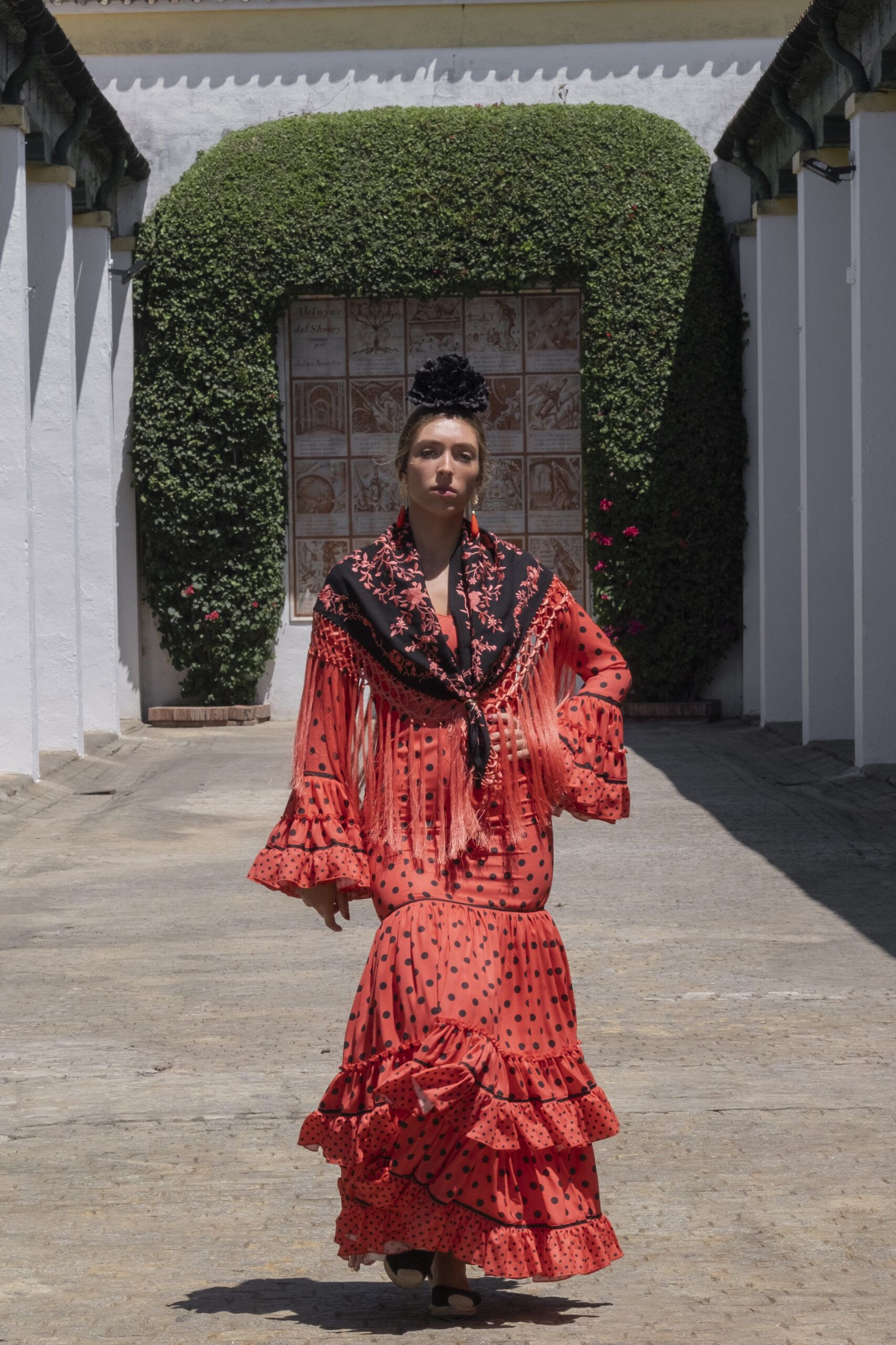 Vestido de flamenca para mujer de color coral con lunares negros, de talle bajo, manga larga y falda de volantes con doble lunar.