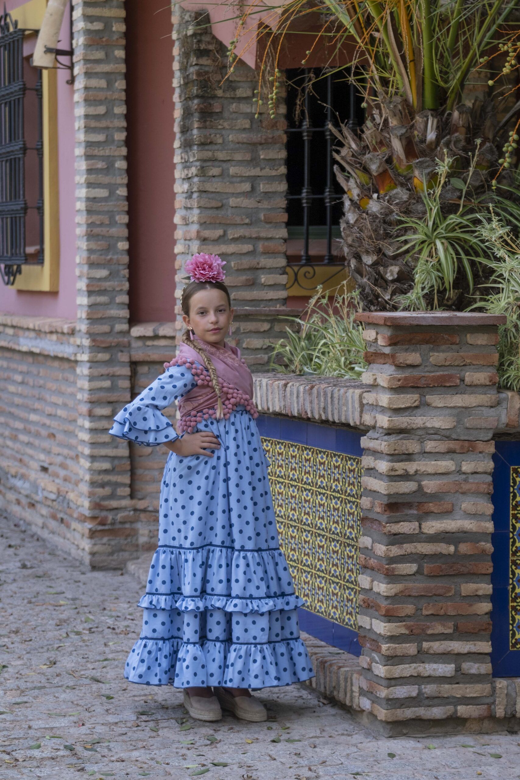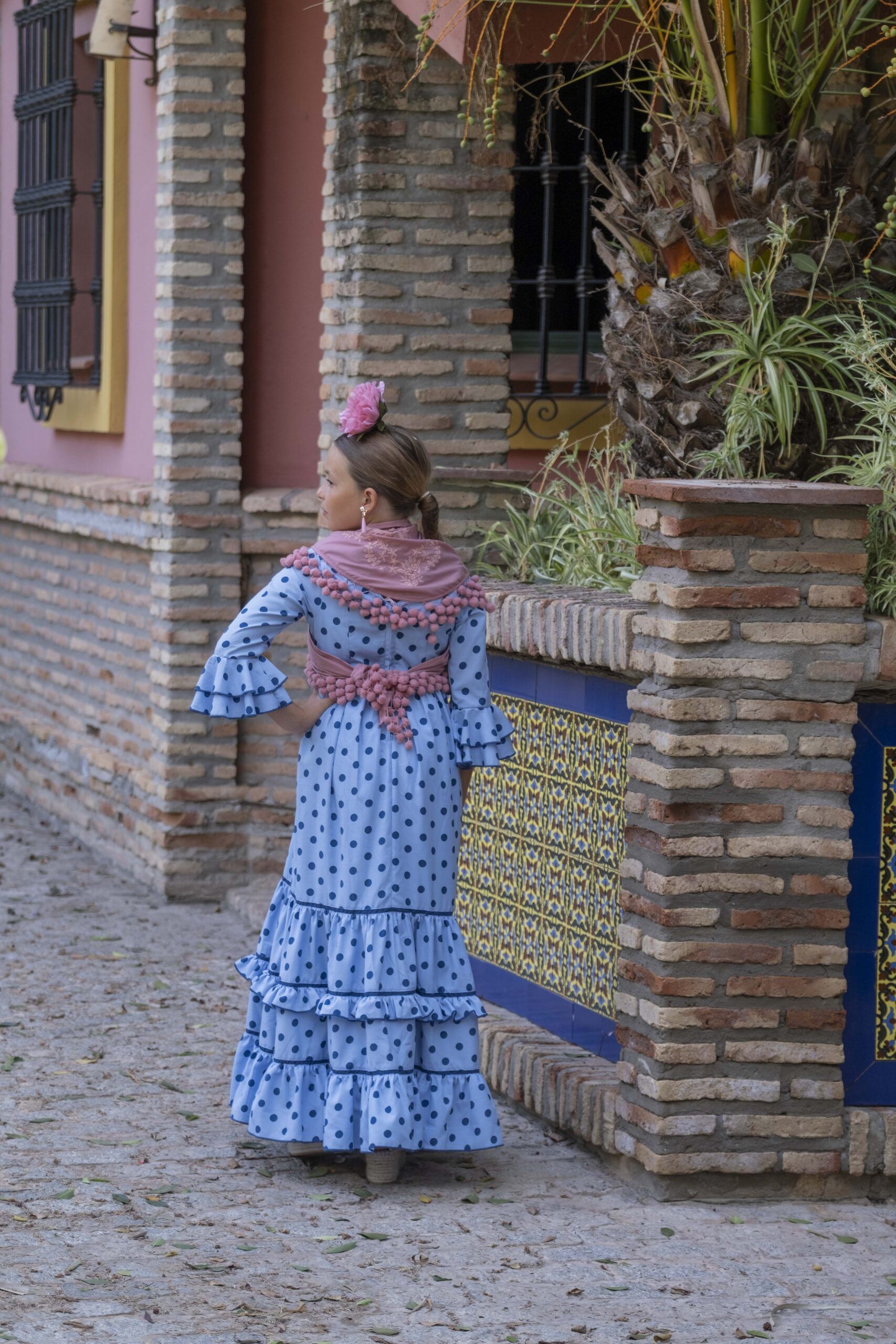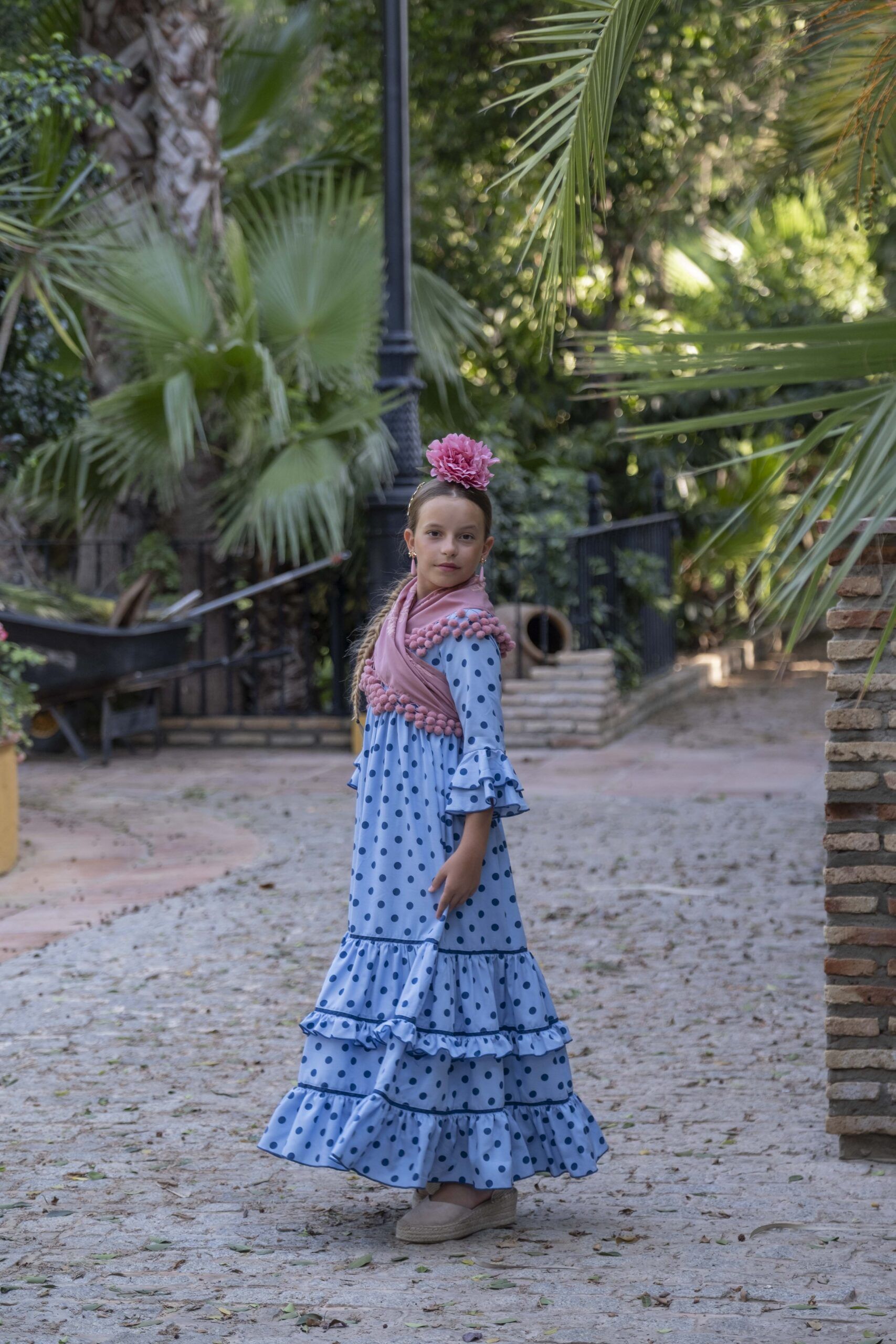 Vestido de flamenca para niña pequeña de color azul con lunares azul marino, de talle alto, manga larga y bajo de volantes. y falda canastera.