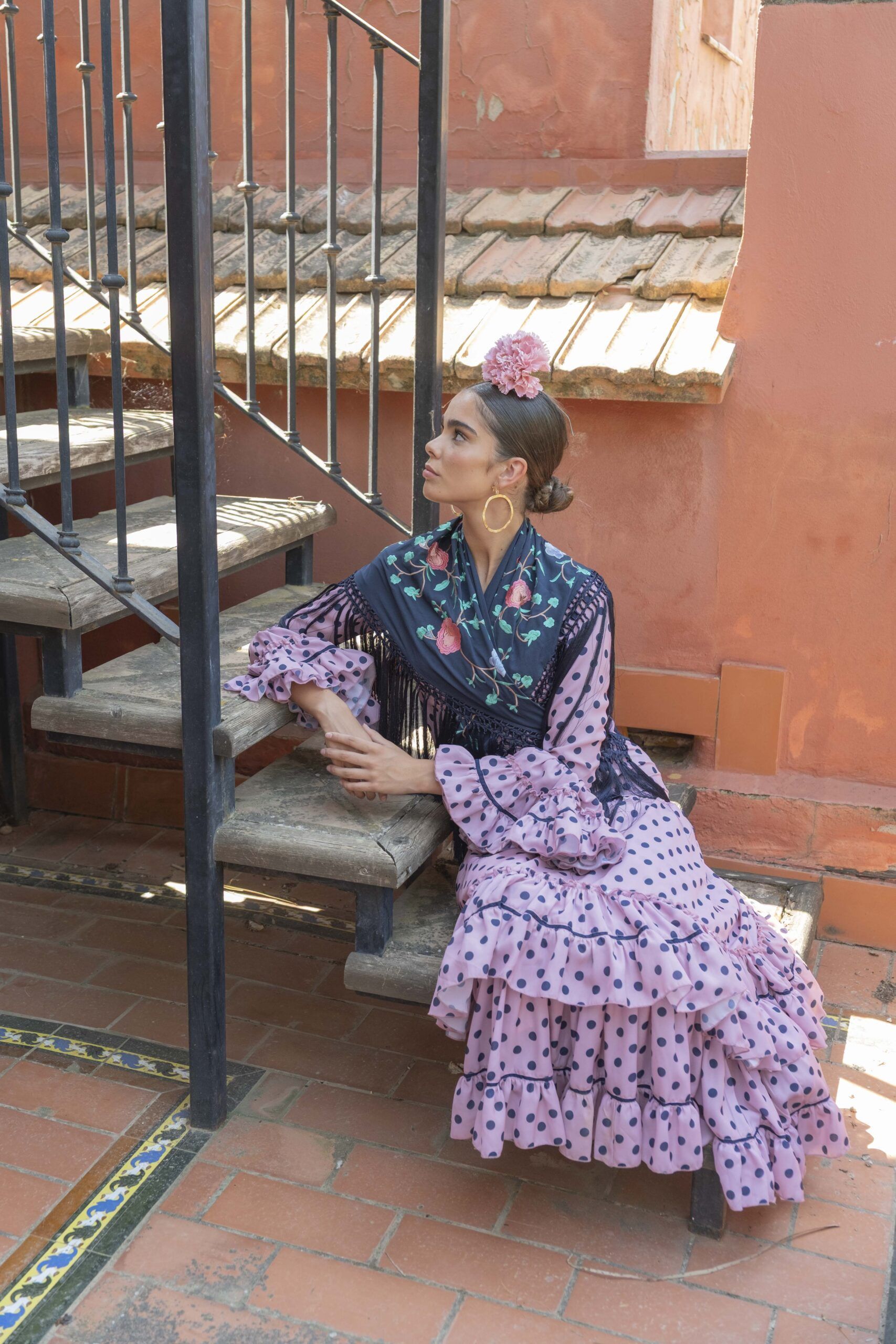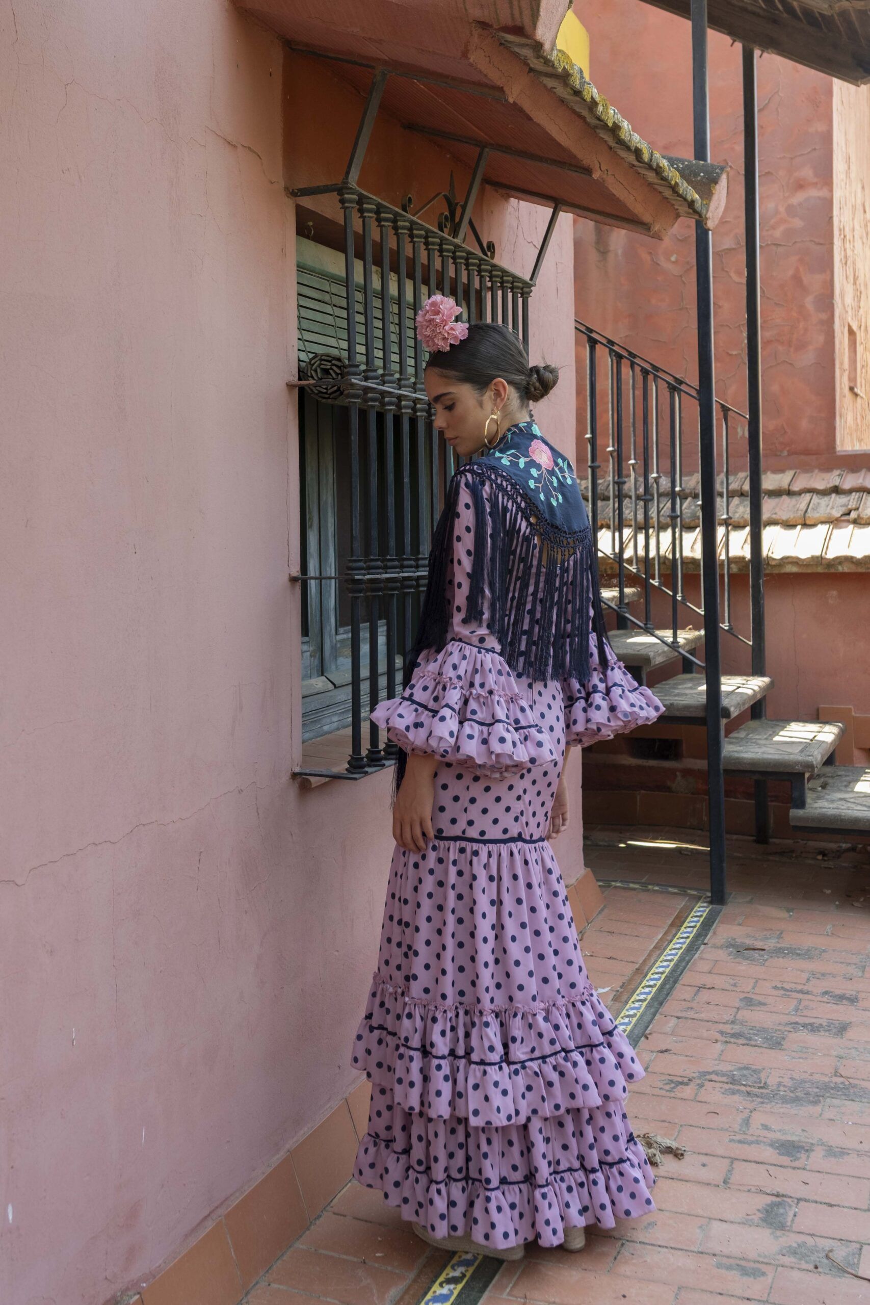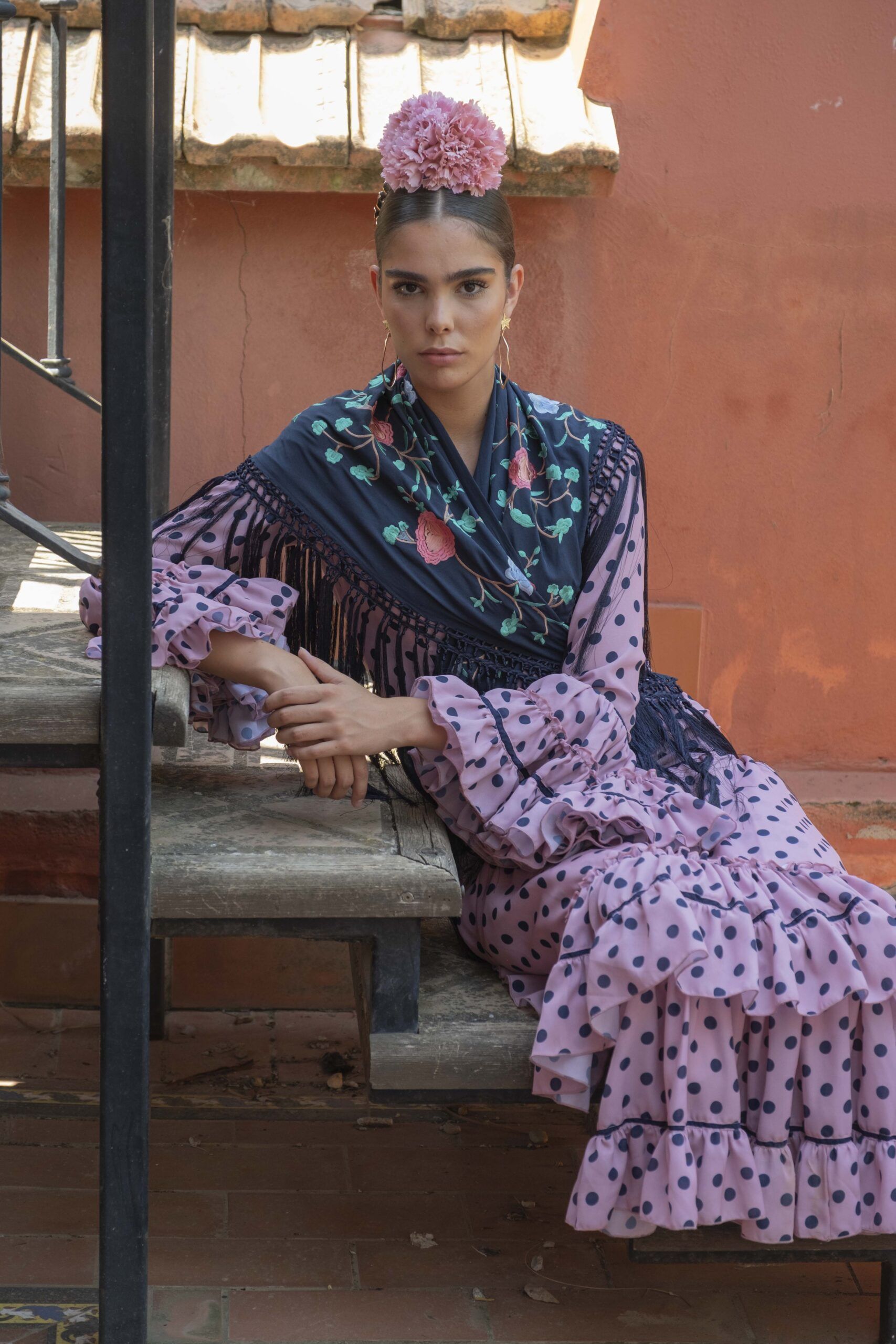 Vestido de flamenca para mujer de color rosa con lunares marinos, de manga larga y falda de volantes.