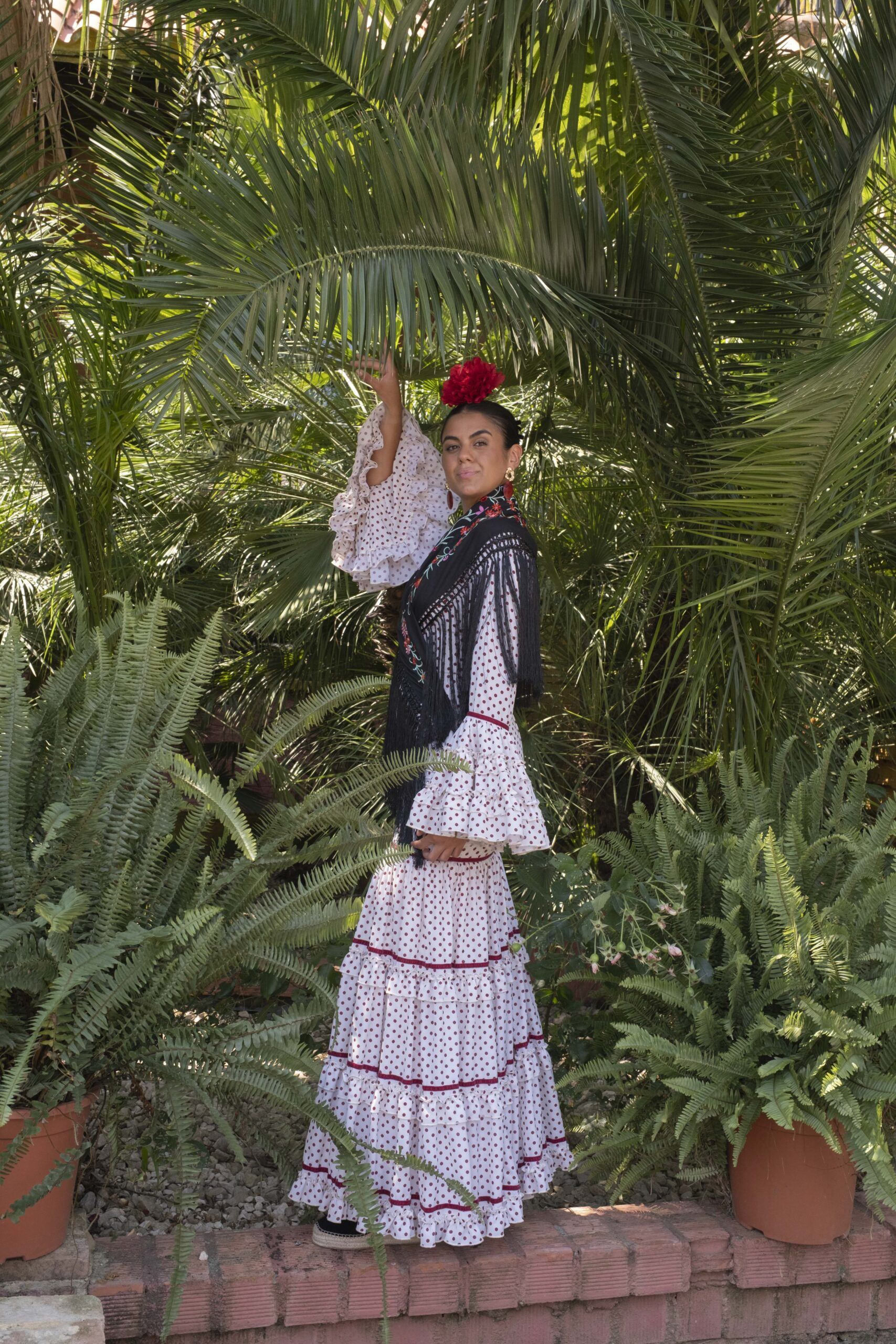 Vestido de flamenca para mujer de color beige con lunares burdeos, de manga larga y falda canastera.