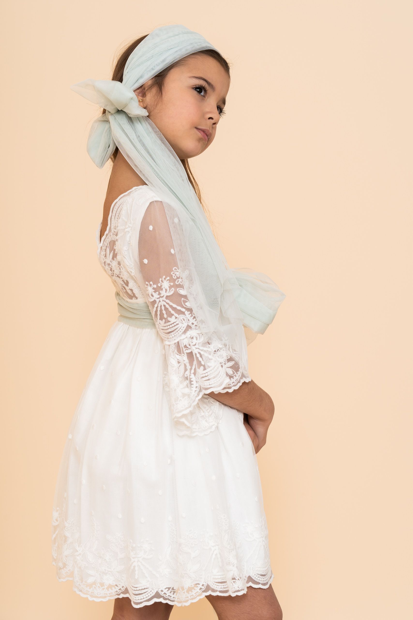 Vestido Niña Pequeña Tul Bordado Blanco Espalda Pico